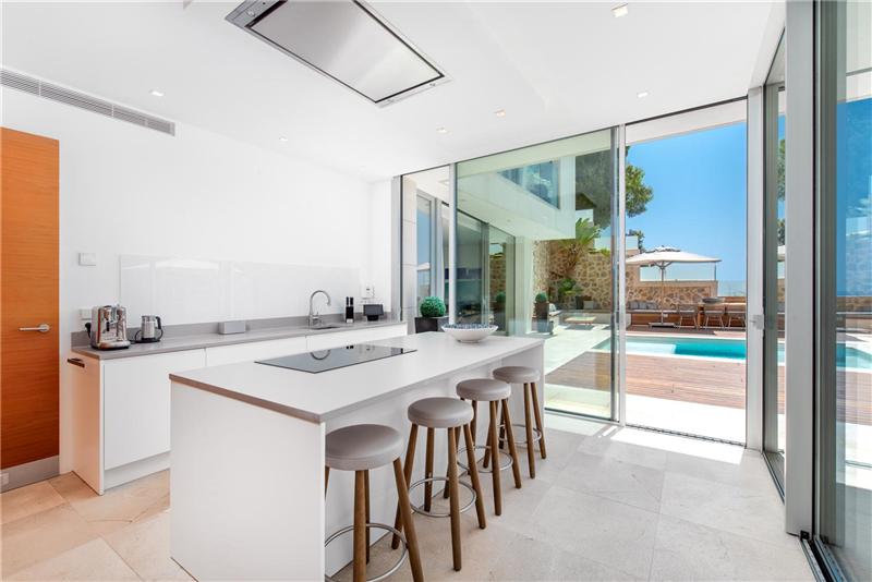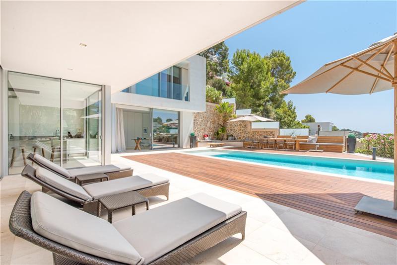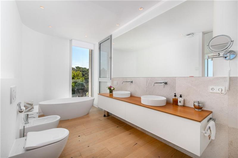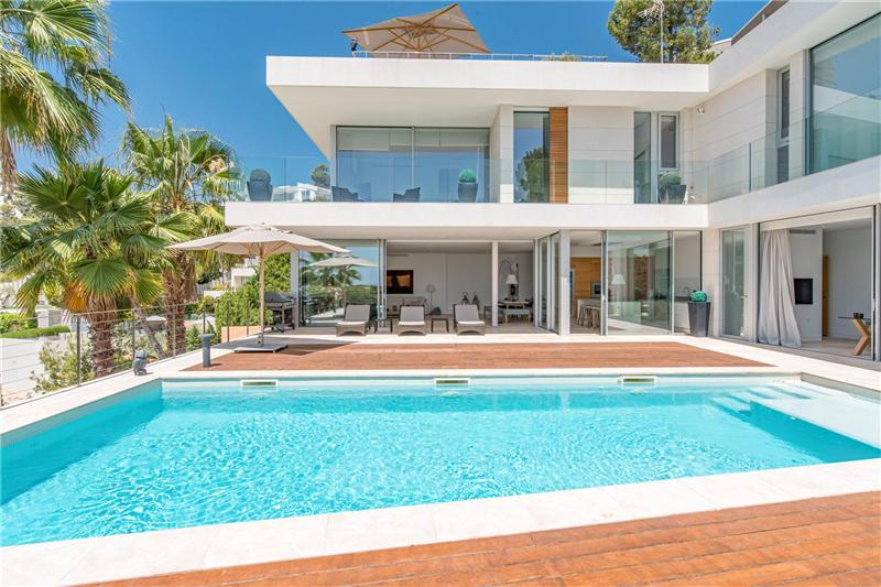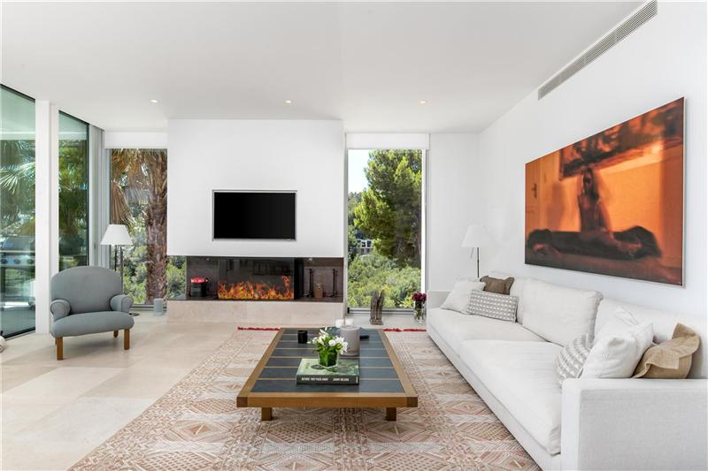 Ca. 445 m² Wohnfläche, heller Wohn-/Essbereich mit Kamin und direktem Zugang zu den Außenbereichen, designorientierte, möblierte und vollständig ausgestattete Küche, Kamin, 4 Doppelschlafzimmer, Hauswirtschaftsraum, 4 Bäder (2 en Suite), Ankleidezimmer, Doppelverglasung, Klimaanlage warm/kalt, Fußbodenheizung, Alarmsystem, mehrere Terrassen, Fitnessbereich mit Sauna, Grillplatz, Gartenbereiche, Garage mit Platz für mehrere Fahrzeuge, Salzwasserpool. Hochwertige Ausstattungen und Materialien.