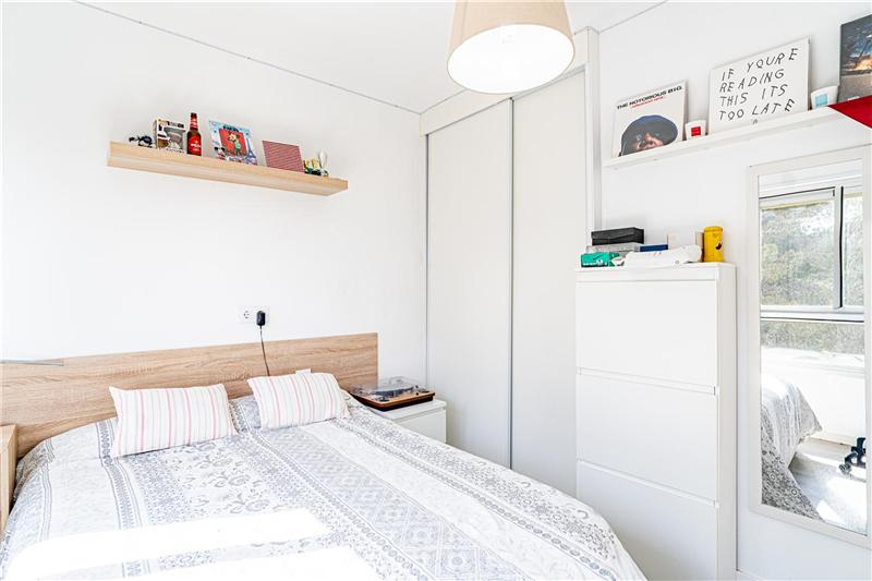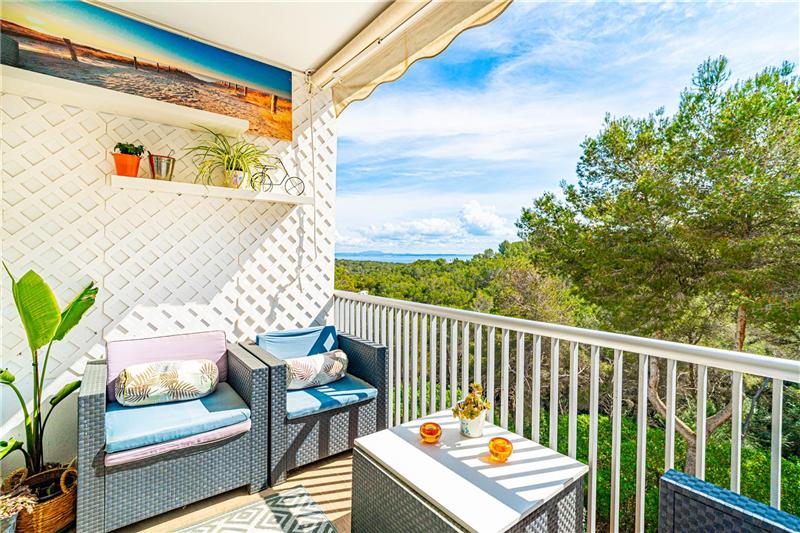 Wohn-/Esszimmer mit Kamin und möblierter sowie ausgestatteter Küche, 3 Doppelschlafzimmer, Einbauschränke, komplettes Badezimmer, Parkettböden, Klimaanlage warm/kalt, weiß lackierte Innentüren, Climalit-Fenster, Terrasse von ca. 8 m², Parkplatz, Abstellraum, Gemeinschaftspool, freier Blick auf das Meer und die Berge. In Meeresnähe.