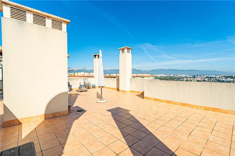 Ca. 100 m² Wohnfläche, Wohn-Esszimmer mit ca. 25 m² mit Kamin und möblierter Küche, 3 Doppelschlafzimmer, Einbauschränke, 2 Badezimmer (1 en Suite), Parkettböden, Climalit-Fenster, Heizung, ca. 100 m² große Dachterrasse, 1 Garagenstellplatz, Gemeinschaftspool. Sehr hell. Freier Ausblick