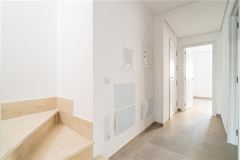 Grundstück von ca. 100m2, geräumiges Wohn-Esszimmer mit integrierter Einbauküche und Zugang zur Terrasse, 3 Schlafzimmer, 2 Bäder (1 en suite), Steinzeugböden, Innenschreinerei weiß lackiert, Vorinstallation von Klimaanlage warm-kalt, Doppelverglasung.