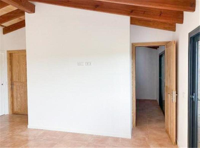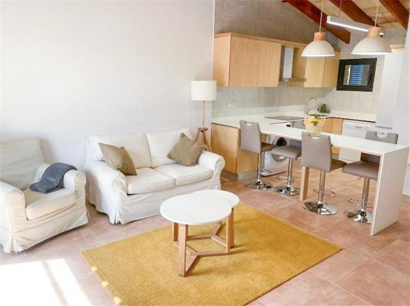 Wohn-Esszimmer mit offener Küche, 2 Schlafzimmer, 1 Badezimmer, Feinsteinzeugböden, Innenschreinerei aus Holz, Klimaanlage warm/kalt, Terrasse und überdachte Veranda, freie Aussicht. Möbliert.
