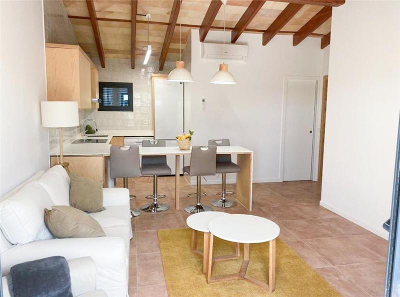 Wohn-Esszimmer mit offener Küche, 2 Schlafzimmer, 1 Badezimmer, Feinsteinzeugböden, Innenschreinerei aus Holz, Klimaanlage warm/kalt, Terrasse und überdachte Veranda, freie Aussicht. Möbliert.