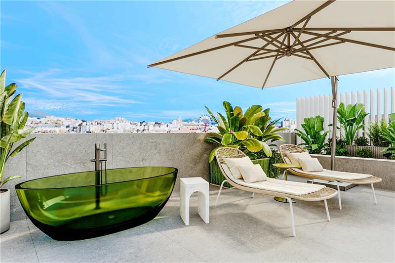 Approx. 96 m2, living-dining room with fully fitted kitchen, 2 double bedrooms with wardrobes and bathroom en suite, underfloor heating, A/C, domotic, terrace of approx. 120 m2, optional garage space, storage room. Communal areas with Spa, cinema room, golf simulator, swimming pool, gymnasium and coffee machine. Expected delivery date 2027. Energy certificate A.