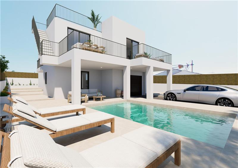 Ca. 260 m² Wohnfläche, großes Wohn-Esszimmer mit offener, möblierter und teilmöblierter Küche, 4 Schlafzimmer mit Einbauschränken, 2 Bäder (eines en suite), Gäste-WC, Fußböden aus Feinsteinzeug, Innenschreinerei in weiß lackiert, Climalit-Fenster, Klimaanlage warm/kalt, Veranda, Terrasse von ca. 29 m², Dachterrasse mit Bergblick, Garten, privater Pool, Solarpaneele, Abstellraum und Stellplatz in der Garage. Fertigstellung Ende 2026.