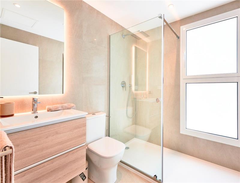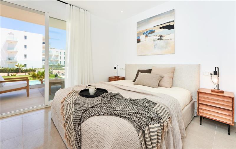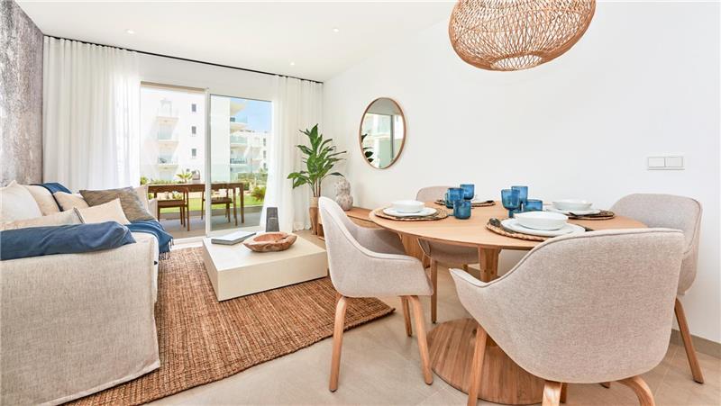 Erdgeschosswohnung mit Wohn-Esszimmer und integrierter, voll ausgestattete Küche, 2 Schlafzimmer, 2 Bäder, Feinsteinzeugböden, Innenausbau in weiß lackiertem Holz, Aerothermie, Split-Klimaanlage, Terrasse von ca. 17,25m2, Parkplatz, Abstellraum, Gemeinschaftspool. Fertigstellung: September 2025.