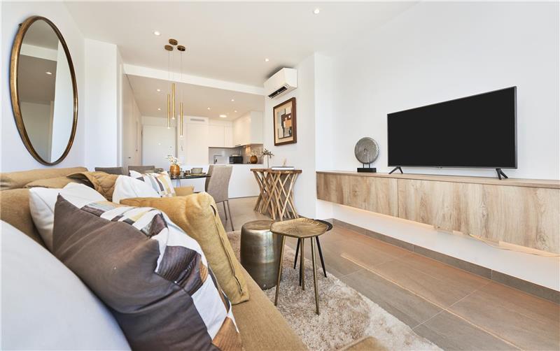 Wohnung mit Wohn-Esszimmer mit integrierter Einbauküche, 2 Schlafzimmern, 2 Bädern, Feinsteinzeugböden, Innenschreinerei in weiß lackiertem Holz, Aerothermie, Split-Wärmepumpe, Terrasse von ca. 17,25m2, Parkplatz, Abstellraum, Gemeinschaftspool. Fertigstellung: September 2025.