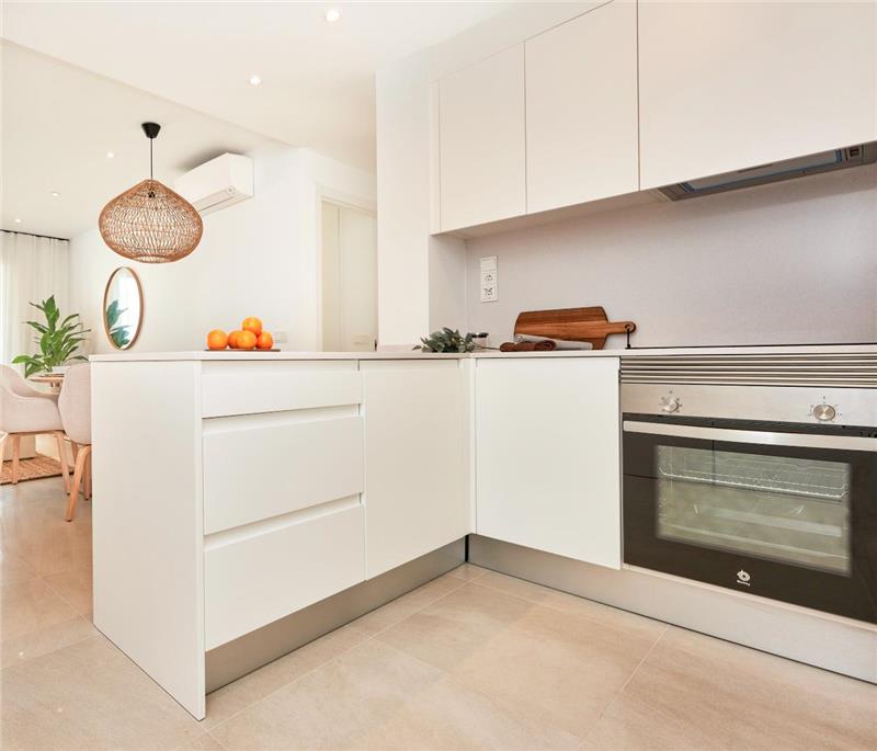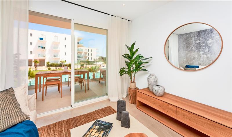 Planta baja con salón comedor con cocina integrada amueblada y equipada, 2 habitaciones, 2 baños, suelos de gres porcelánico, carpintería interior de madera lacada en blanco, aerotermia, bomba aire split, terraza de 17,25m2 aprox., plaza de parking, trastero, piscina comunitaria. Fecha de Entrega: Septiembre de 2025.