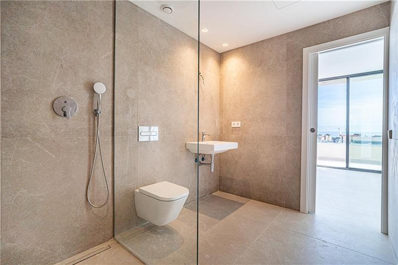 170 m² aprox. ,luminoso salón comedor, gran cocina amueblada y semi equipada, coladuria, 3 dormitorios, armarios, 1 baño (1 en suite), suelos de gres porcelánico, calefacción suelo radiante, sistema aerotermia, aire acondicionado frio/calor, trastero, plaza de garaje, terraza y porche. Desde la terraza se accede al solárium privado de 65 m² aprox. en la planta cubierta. Salida privada a la piscina y al solárium comunitario. Vistas despejadas a Bahía de Palma.