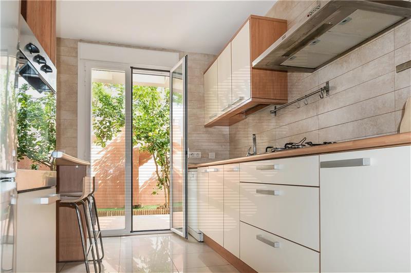salón comedor con salida a terraza, cocina amueblada, 2 habitaciones dobles con armarios, 1 baño, suelos porcelánicos, aire acondicionado frio/calor, calefacción, climalit, terraza de 22 m2 aprox. , jardín de 35 m2, plaza de garaje y zona comunitaria con piscina.